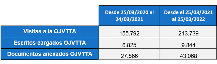 Al 25 de marzo de 2022 el portal ha recibido un total de 369.531 visitas, 16.669 escritos cargados y 70.634 documentos anexados, siendo un aporte en materia de digitalización. A lo anterior, se suma el constante monitoreo y perfeccionamiento de los sistemas, por parte de la Unidad Administradora, lo que aseguró una disponibilidad usuaria cercana al 100% (UPTIME).