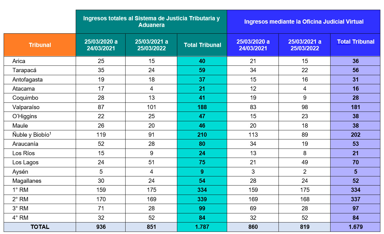 Santiago, 11 de abril. El pasado 25 de marzo de 2022 se cumplieron 2 años desde la entrada en funcionamiento de la Oficina Judicial Virtual, implementada por la Unidad Administradora, en el sitio web de los Tribunales Tributarios y Aduaneros (TTA). Durante este periodo, se registraron 1.787 nuevas causas a nivel nacional, de las cuales un 94%, es decir, 1.679 reclamaciones ingresaron por la modalidad virtual.